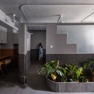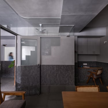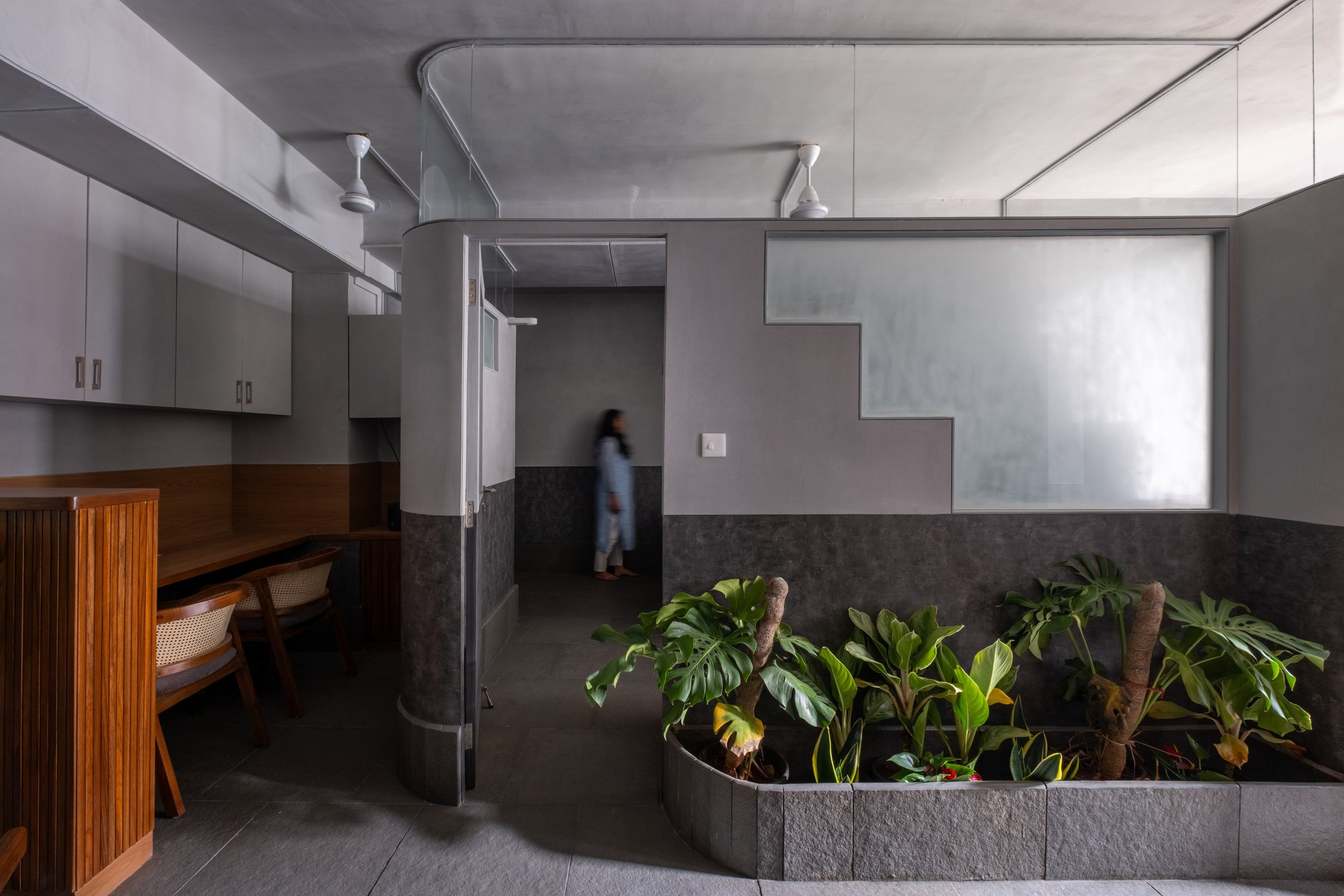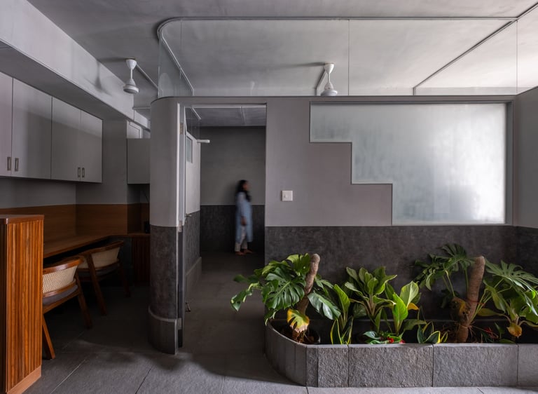 The program required two cabins and workstations. Glass partitions at higher levels created seamless visual continuity, making spaces feel interconnected and expansive. A central planter became the living core, bringing nature into the otherwise dark interior.