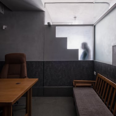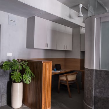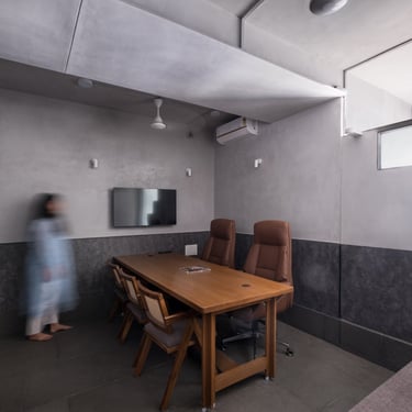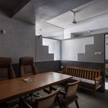 This 450 sqft builder’s office in a commercial building faced a challenge: only a terrace and single window provided light and ventilation. The solution emerged through furniture-level detailing, turning constraints into design opportunities.